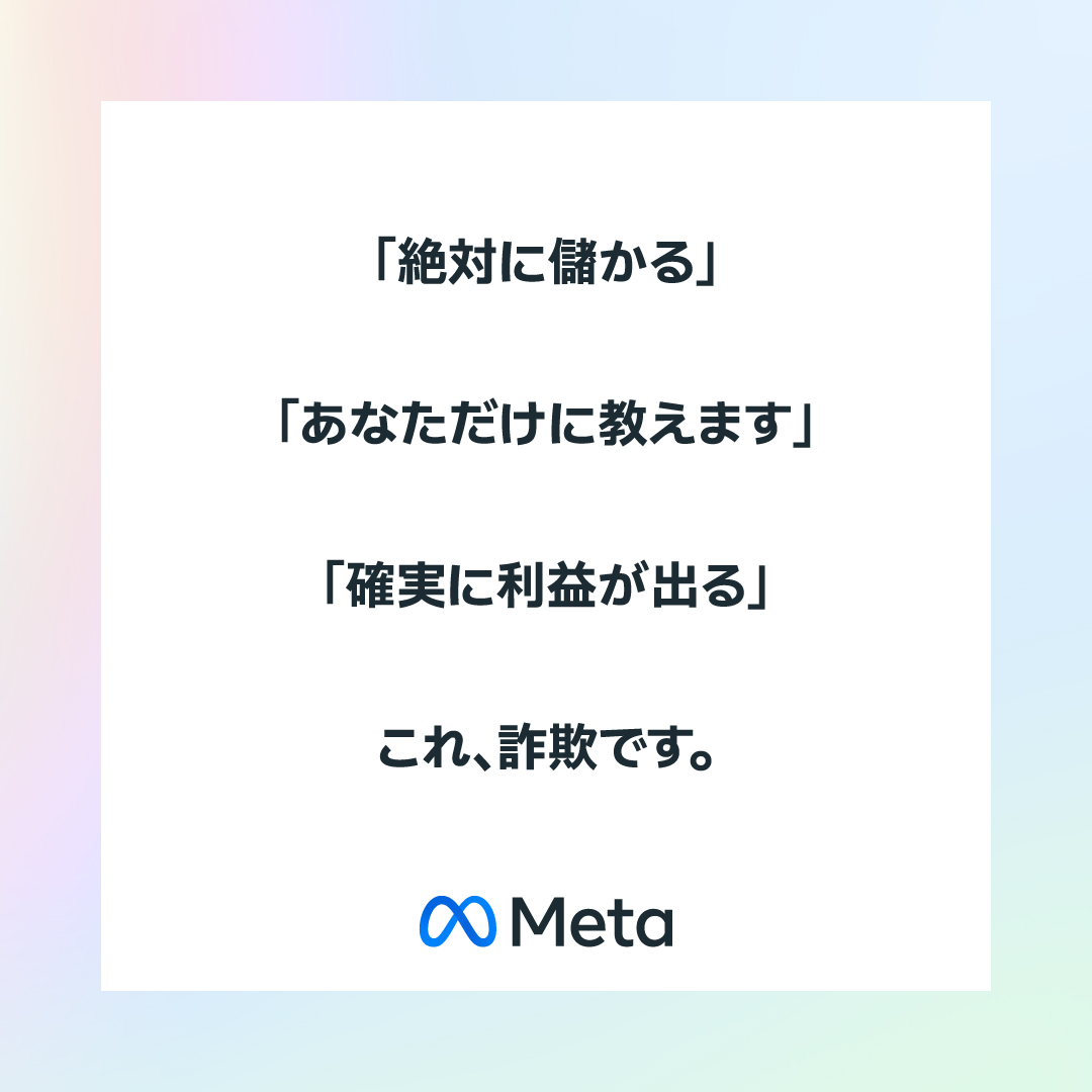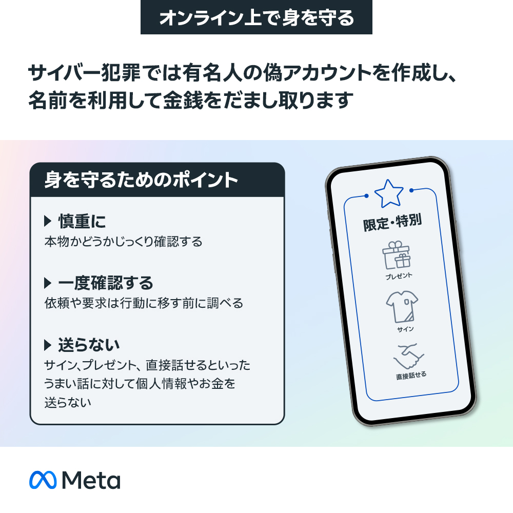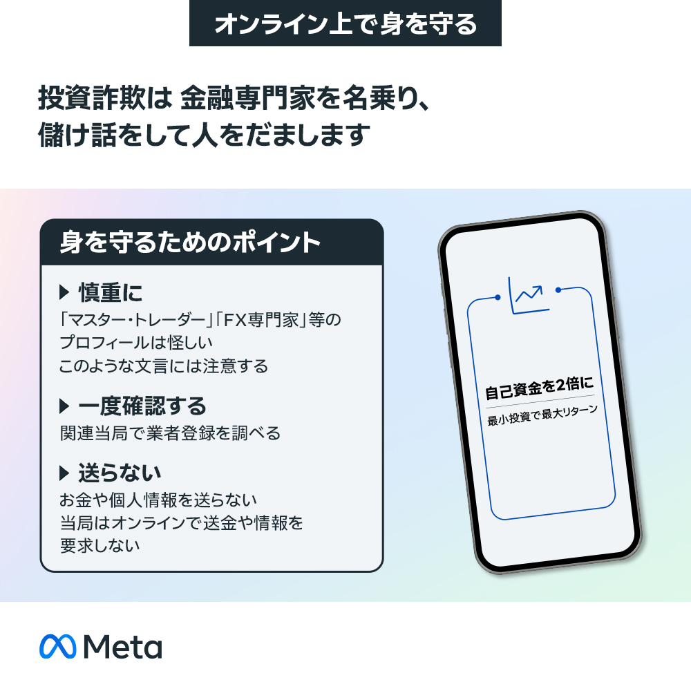 また、これまでも詐欺に関する注意喚起を行っており、例えば、昨年11月から12月にかけてに実施した詐欺防止キャンペーンでは、オンライン上に存在する詐欺から利用者が身を守れるように、様々な詐欺の種類を想定した形でよくある手口や身を守るためのポイントを紹介しました。弊社プラットフォームにおいて3週間展開し、1,600万人以上にリーチ、3,200万回以上の閲覧がありました。7月上旬からは、新たに関係機関の協力のもと、詐欺被害防止のための注意喚起をFacebookとInstagram上で展開しています。SNS型投資詐欺やロマンス詐欺に関して、利用者に直接注意を促す表現を用いた広告を相談窓口の情報等と共に掲載します。このような取り組みを今後も続けていく予定です。