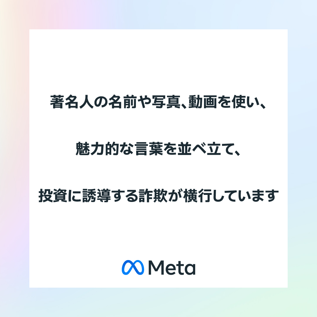 利用者の安全を守ることはMetaにとって最重要事項です。詐欺の被害を受けた利用者の方々がいらっしゃること、また多くの皆様にご心配をお掛けしていることを大変重く受け止めています。こうした状況を受け、私たちは詐欺広告に対する取り組みを強化し、著名人の画像を使用した広告を含む詐欺や不正行為を阻止し、オンライン上の詐欺に対して注意喚起を行うなど、あらゆる角度から踏み込んだ対策と措置を講じています。詐欺との戦いに終わりはなく、今後も取り組みを続けてまいりますが、本日は現在強化している取り組みと進捗に関してご紹介いたします。