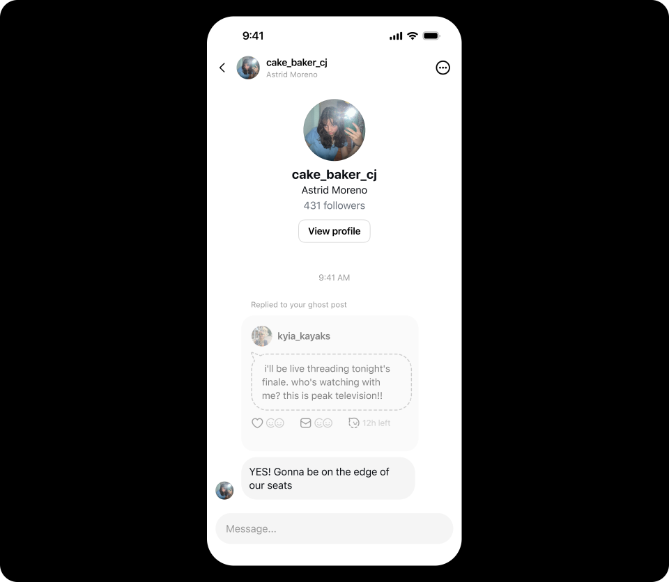 自分のゴースト投稿へ返信があると、DMとして自分の受信箱に届きます。誰がいいね!や返信したのかを見ることができるのは、ゴースト投稿をシェアした利用者本人だけです。返信ができるのは投稿者がフォローしている人だけで、それ以外の利用者からの返信はメッセージリクエストフォルダに届きます。