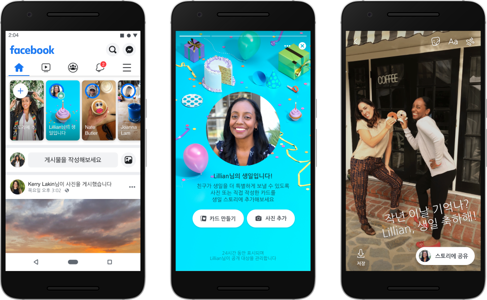 앞으로 Facebook의 ‘생일 스토리’를 통해 더욱 특별한 생일을 보내고 친구 및 가족들과 더욱 가까워지는 기회를 만날 수 있을 것입니다.
