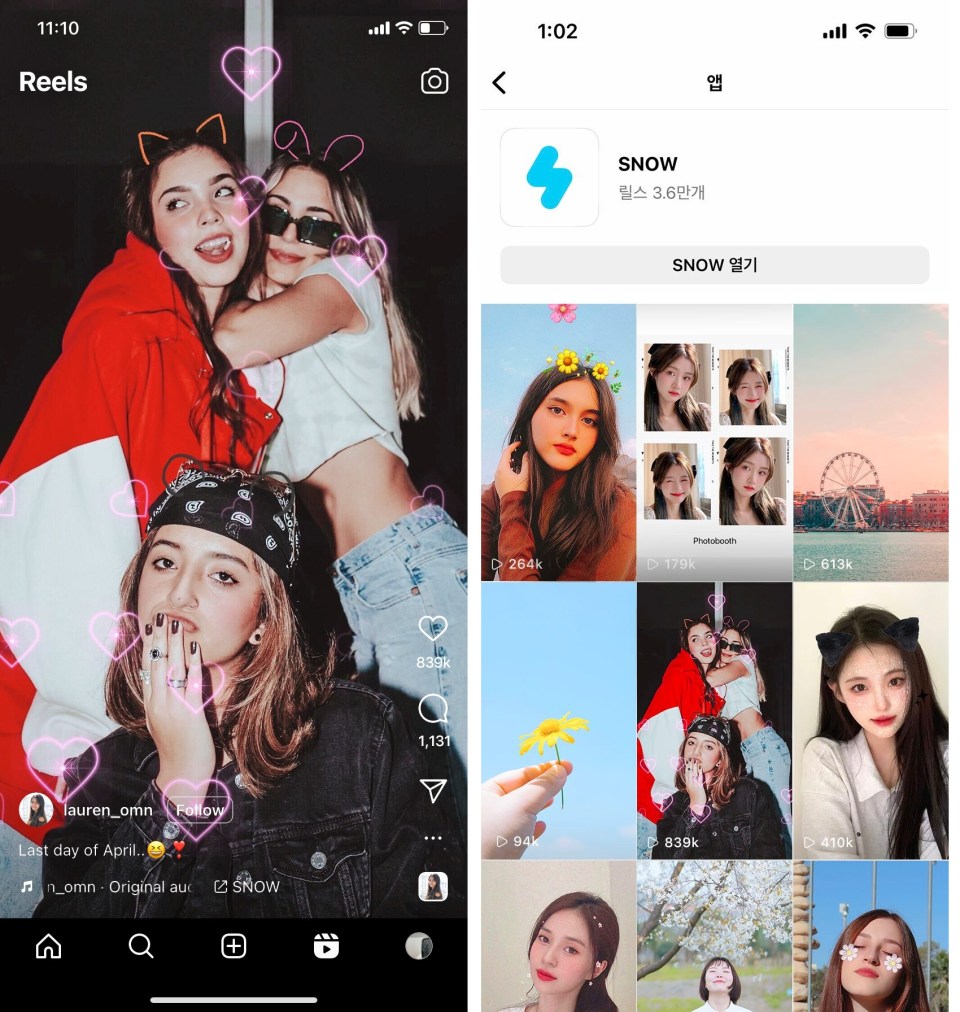 Instagram이 스노우(SNOW)와의 파트너십을 통해 제3의 외부 영상 편집 앱에서 만든 영상을 릴스로 바로 공유하고, 공유된 영상들을 한 데 모아볼 수 있는 기능을 출시했습니다. 현재 Instagram은 ▲스노우 ▲B612 ▲VITA 앱에서 촬영 및 편집한 짧은 길이의 영상을 클릭 한 번으로 Instagram 릴스에 바로 공유할 수 있는 기능을 지원하고 있습니다. 이번 업데이트는 앱에서 Instagram 릴스로 공유된 영상에 한해, 영상 하단에 편집 앱의 출처를 보여주는 기능을 포함합니다. 또한, 해당 앱을 통해 공유된 릴스 게시물을 별도로 생성된 페이지에서 둘러볼 수도 있습니다.