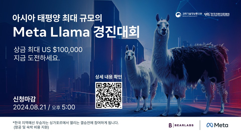 이는 Llama 출시 이후 한국에서 처음으로 열리는 기술 솔루션 경진대회로, 과학기술정보통신부와 한국전파진흥협회가 후원합니다. 참가 자격은 Llama를 기반으로 제품이나 서비스를 개발했거나 현재 개발 중이며, 운영한 지 최소 1년 이상 되는 기업 및 단체입니다. 참가 분야는 ▲사회적 효과 ▲경제적 효과 두 가지 주제 중 선택할 수 있습니다.
