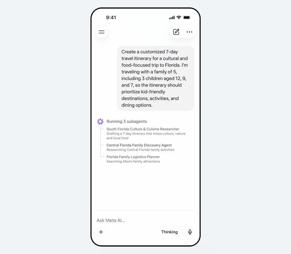 Meta AI 앱과 meta.ai가 오늘 새로운 모습과 함께 업그레이드됩니다. 빠른 답변이 필요한 간단한 질문부터 정교한 추론이 필요한 복잡한 문제까지, 이제 Meta AI 하나로 모두 가능합니다. 이용자는 작업에 따라 모드를 전환할 수 있으며, Meta AI는 여러 개의 서브 에이전트를 동시에 실행해 질문을 해결할 수 있습니다. 예를 들어, 플로리다행 가족 여행을 계획할 때, 한 에이전트는 여행 일정을 짜고, 다른 에이전트는 올랜도와 플로리다 키스 지역을 비교하며, 또 다른 에이전트는 아이와 함께할 수 있는 활동을 찾는 등 각각 다른 작업을 동시에 수행해 더 빠르고 완성도 높은 답변을 제공합니다.