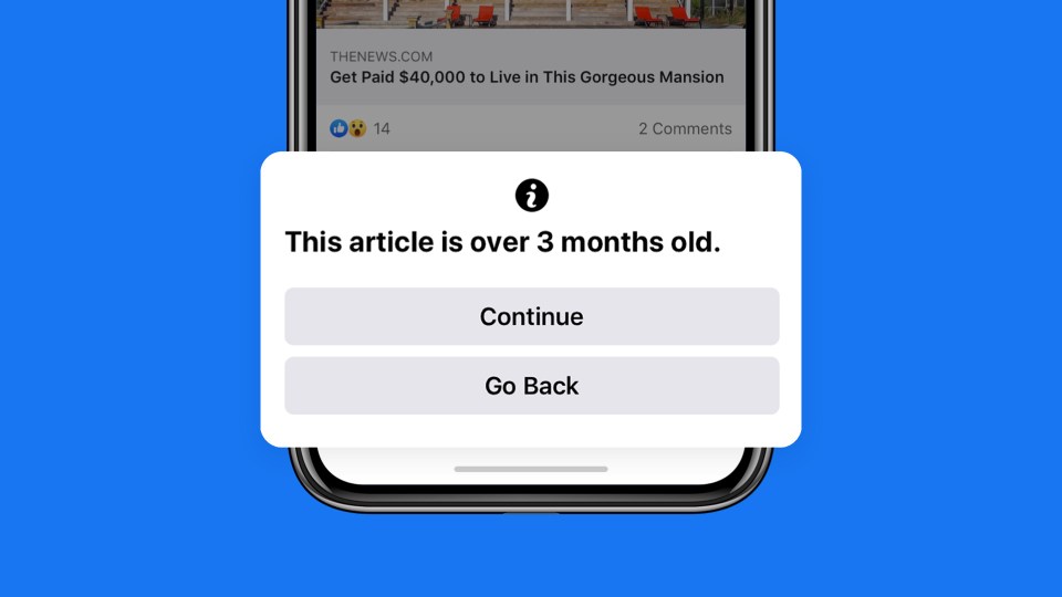 Para garantizar que las personas tengan el contexto que necesitan para tomar decisiones informadas sobre qué compartir en Facebook, la pantalla de notificaciones aparecerá cuando hagan clic en el botón «compartir» en los artículos que tengan más de 90 días. Las personas siguen teniendo la posibilidad de compartir las publicaciones de más de 90 días que consideran continúan siendo relevantes.