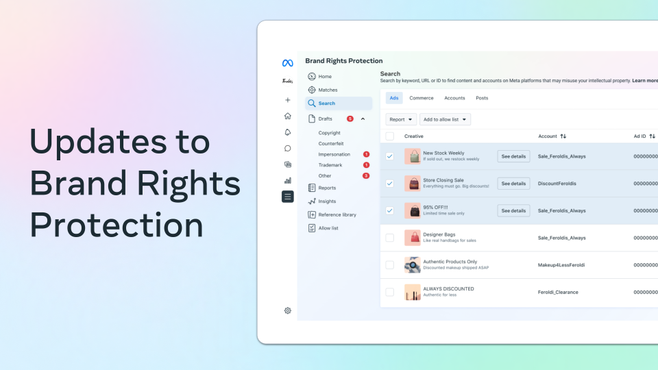 Tras una prueba inicial, todas las empresas inscritas en la Protección de derechos de marca tienen ahora la posibilidad de reportar anuncios fraudulentos a gran escala, incluso cuando no utilicen explícitamente su propiedad intelectual. Esto incluye anuncios sospechosos y engañosos que explotan el nombre de una marca sin autorización.