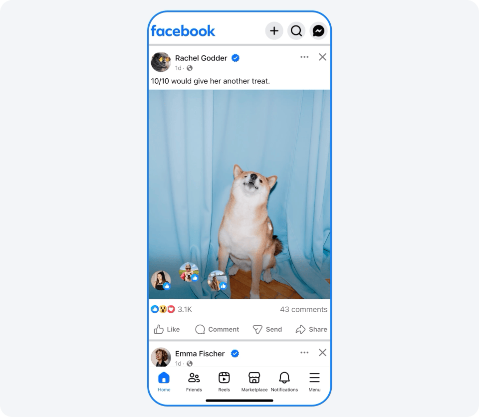 Facebook sigue siendo el lugar ideal para todo tipo de videos, y nuestras recomendaciones te ayudarán a ver contenido más reciente en los formatos que más disfrutas. Si prefieres los videos largos, hay buenas noticias: los Reels de más de un minuto representan una cuarta parte de los Reels creados por personas con más de 10,000 seguidores, y más del 50% del tiempo de visualización en la plataforma. Además, nuestro motor de recomendaciones ahora destaca un 50% más de Reels publicados ese mismo día por creadores, para que accedas a lo más nuevo de forma más rápida.