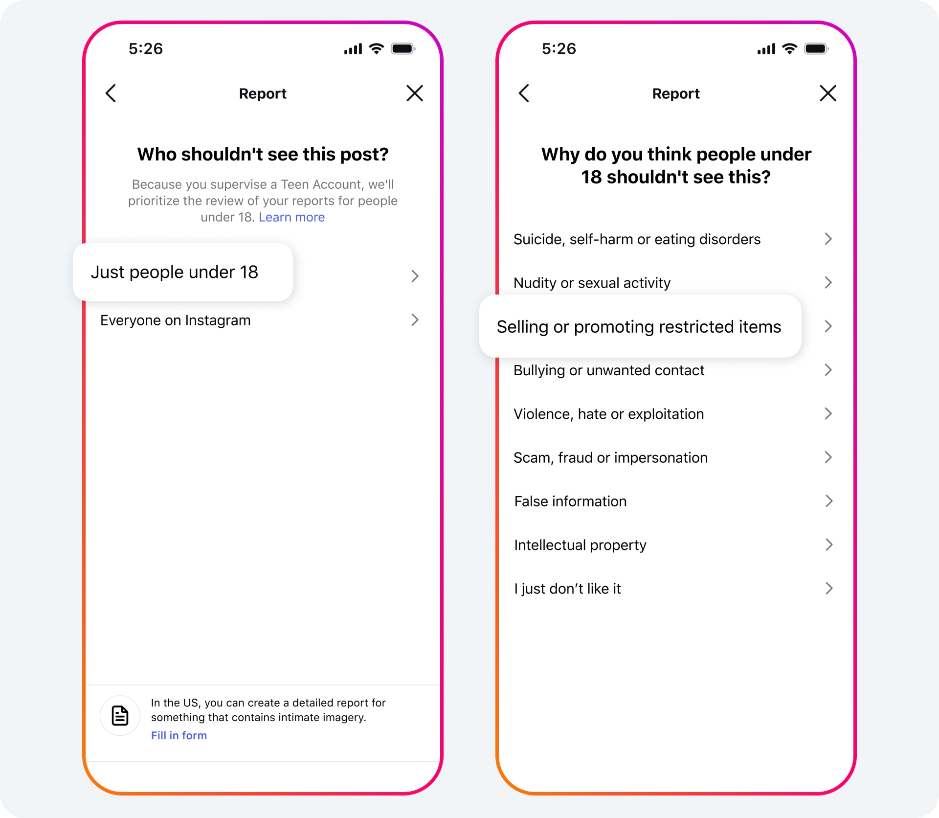 También estamos probando una nueva forma para que los padres que usan herramientas de supervisión puedan marcar cualquier publicación que vean en Instagram y que consideren que debería estar oculta para adolescentes, y decirnos por qué. Si estas publicaciones aún no están ocultas para adolescentes, las enviaremos a nuestros equipos para una revisión prioritaria y notificaremos al padre el resultado.