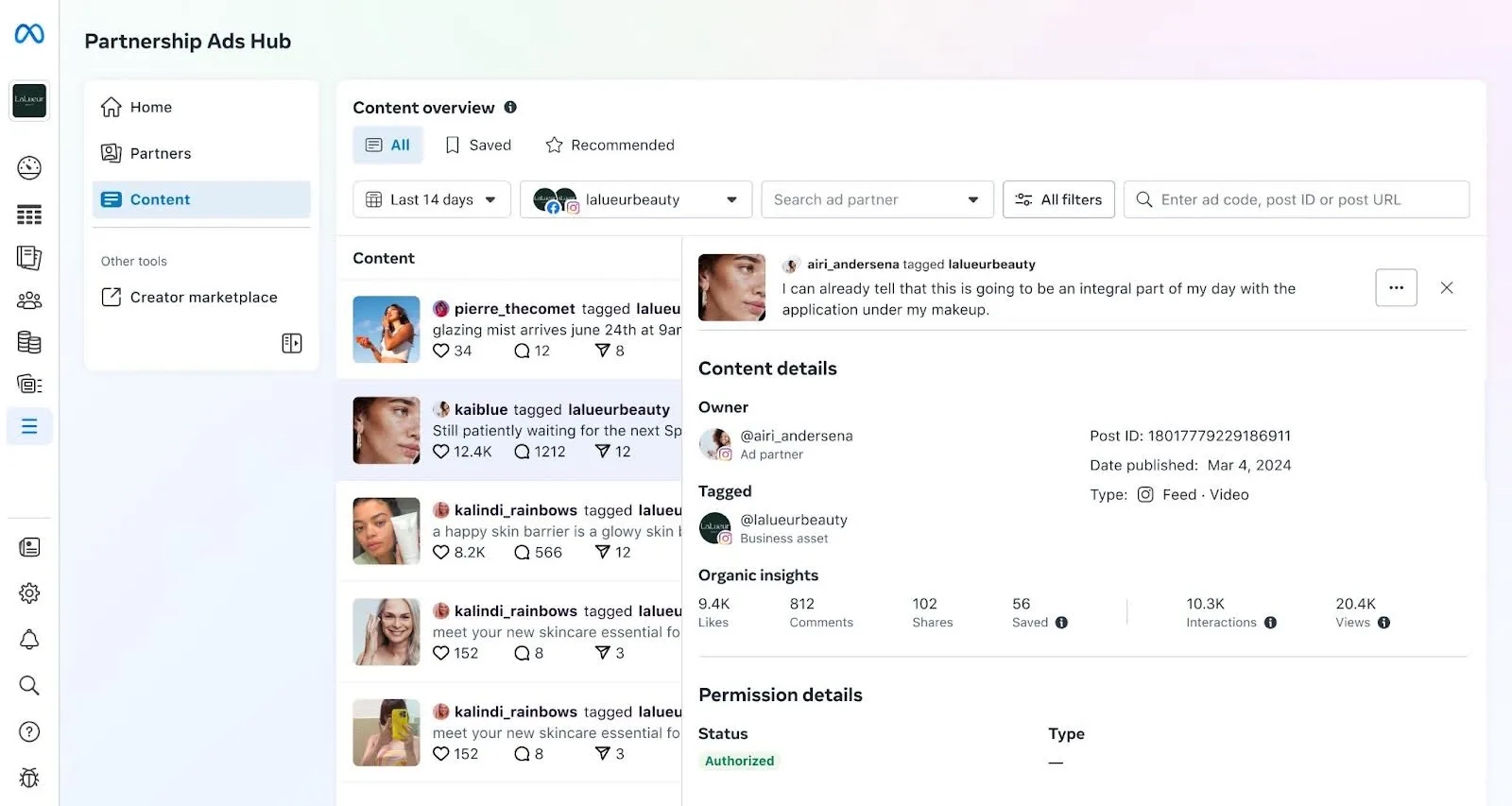- Por último, mejoramos los permisos de contenido en Facebook. Ahora, los creadores tienen una forma más sencilla de etiquetar a un socio al crear contenido de marca y—un gran ahorro de tiempo—pueden compartir proactivamente un código de anuncio con un anunciante para otorgar permisos de anuncios de colaboración. También pueden compartir códigos de anuncio al usar contenido generado por usuarios existente o al crear nuevo UGC, incluso cuando la marca no está etiquetada en la publicación. Esto cambia el proceso: en lugar de que los anunciantes tengan que asegurar permisos, los creadores pueden proporcionarlos fácilmente, acelerando el lanzamiento.
