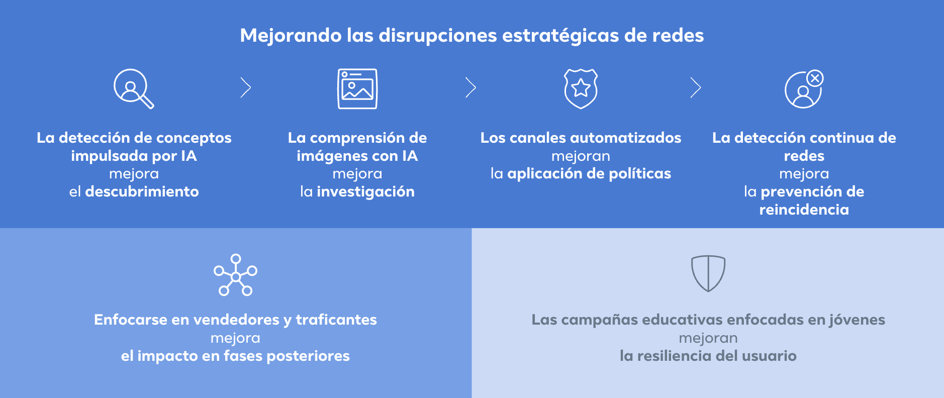 Los métodos descritos en esta sección no son las únicas nuevas acciones que nuestros expertos aplican a las Disrupciones Estratégicas de Redes contra cárteles y grupos dedicados a operaciones con narcóticos ilegales. Desarrollamos regularmente nuevas herramientas impulsadas por IA, que mejoran nuestra capacidad para detectar y aplicar las normas a actores adversariales. A medida que nuestros adversarios buscan desarrollar nuevas estrategias de evasión, Meta invierte en herramientas y metodologías para contrarrestar esos esfuerzos.