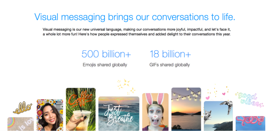 Visual messaging is now our new universal language, making our conversations more joyful, impactful, and let’s face it, a whole lot more fun! This year we continued investing in our powerful and fast camera, pre-loaded with thousands of stickers, frames and other effects to make your conversations better than ever. Here’s how people expressed themselves and added delight to their conversations this year: