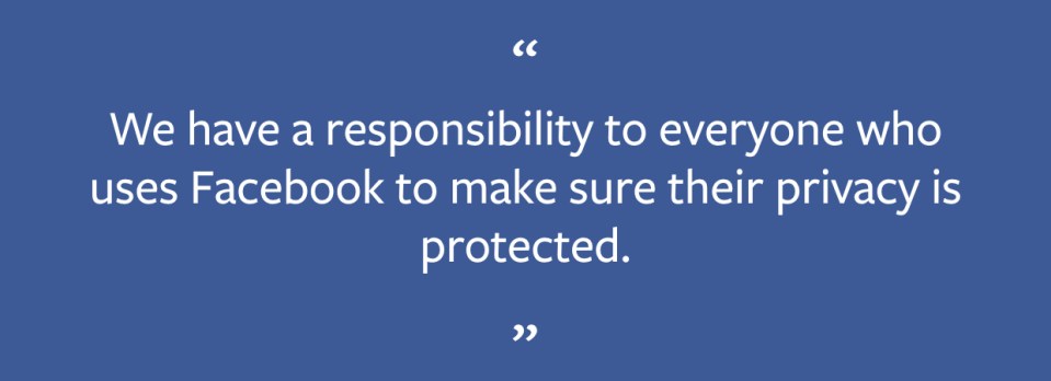 Even with these changes, we’ve seen abuse of our platform and the misuse of people’s data, and we know we need to do more. We have a responsibility to everyone who uses Facebook to make sure their privacy is protected. That’s why we’re making changes to prevent abuse. We’re going to set a higher standard for how developers build on Facebook, what people should expect from them, and, most importantly, from us. We will: