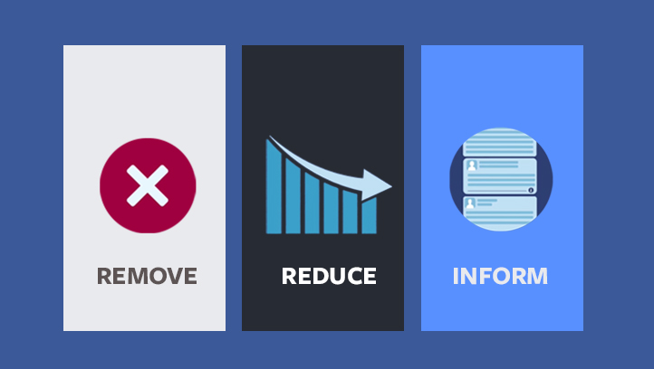 Misleading or harmful content on Facebook comes in many different flavors, from annoyances like clickbait to more damaging things like hate speech and violent content. When we detect this kind of content in News Feed, there are three types of actions we take: remove it, reduce its spread or inform people with additional context.