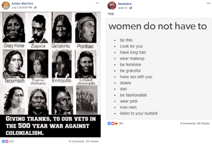 - The most followed Facebook Pages were “Aztlan Warriors,” “Black Elevation,” “Mindful Being,” and “Resisters.” The remaining Pages had between zero and 10 followers, and the Instagram accounts had zero followers.