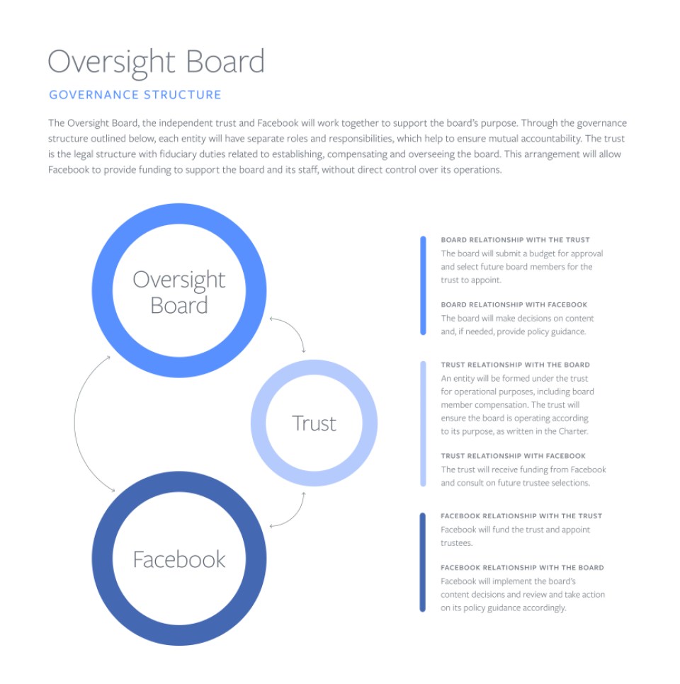 We often received a key piece of feedback: make sure the board is independent from Facebook. One way we’re addressing this is by establishing an independent trust. The Oversight Board, the trust and Facebook will have separate roles and responsibilities, all of which will work to ensure that the board is set up for success.