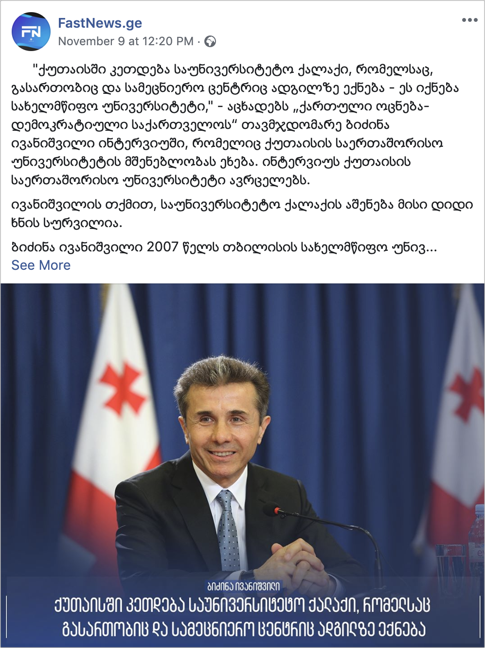 Translation: “There will be University city in Kutaisi that will also host scientific and leisure centres – this will be state university” – says chairman of “Georgian Dream – Democratic Georgia” Bidzina Ivanishvili in the interview regarding building international university in Kutaisi. Interview is shared by international university of Kutaisi. Ivanishvili says, that building university city is his long time gream. In 2007 Bidzina Ivanishsvili..