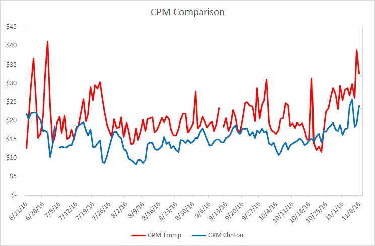 Here is the CPM (cost per 1,000 impressions) comparison on Trump campaign ads vs. Clinton campaign ads. Given the recent discussion about pricing, we’re putting this out to clear up any confusion. The chart shows that during the general election period, the Trump campaign paid slightly higher CPM prices on most days.