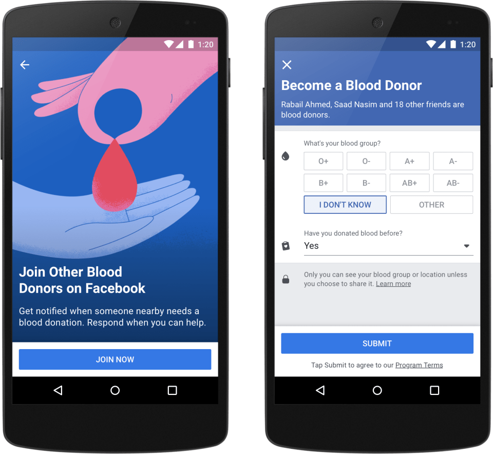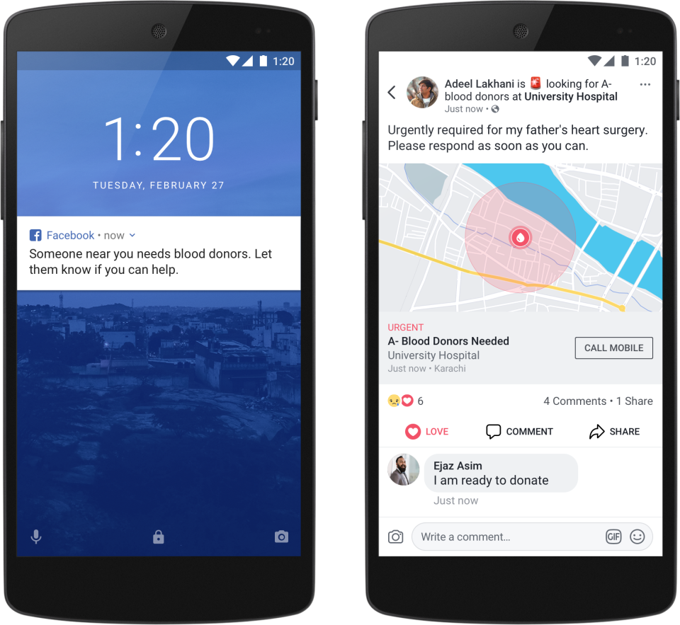 Today, Facebook is launching a blood donations feature in Pakistan to make it easier for people to sign up to be blood donors, and to help connect donors with people and organizations in need. Pakistan, like many countries, has a shortage of safe blood. In some cases, this shortage means patients and their families are responsible for finding donors to replace the blood they receive from blood banks or hospitals. This can cause high-stress situations as people try to find blood donors on their own. Many people are reaching out to their networks on Facebook. There are thousands of posts each month in Pakistan seeking blood donors on Facebook, and over 100,000 people in blood donation groups.